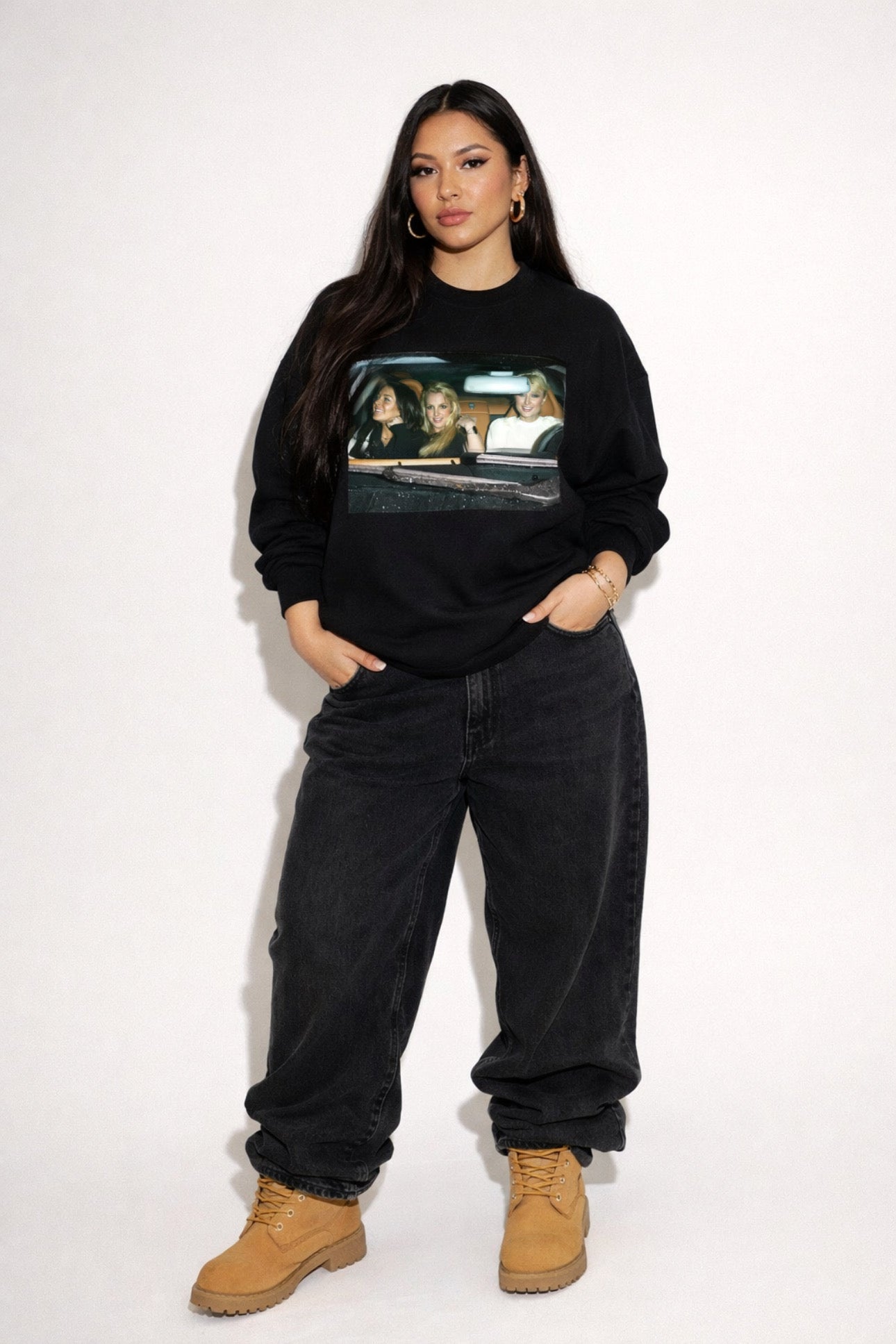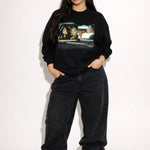 The front features a legendary pop culture moment with Lindsay Lohan, Paris Hilton, and Britney Spears cruising through the night like the ultimate Y2K bad girl trio. It's messy, iconic, and unapologetic — exactly the energy this crewneck brings.