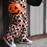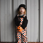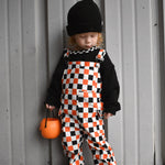 Where spooky season meets rad kid style. These black, orange  + white checkerboard overalls are made for pumpkin patch runs, trick-or-treat adventures, and everything in between.