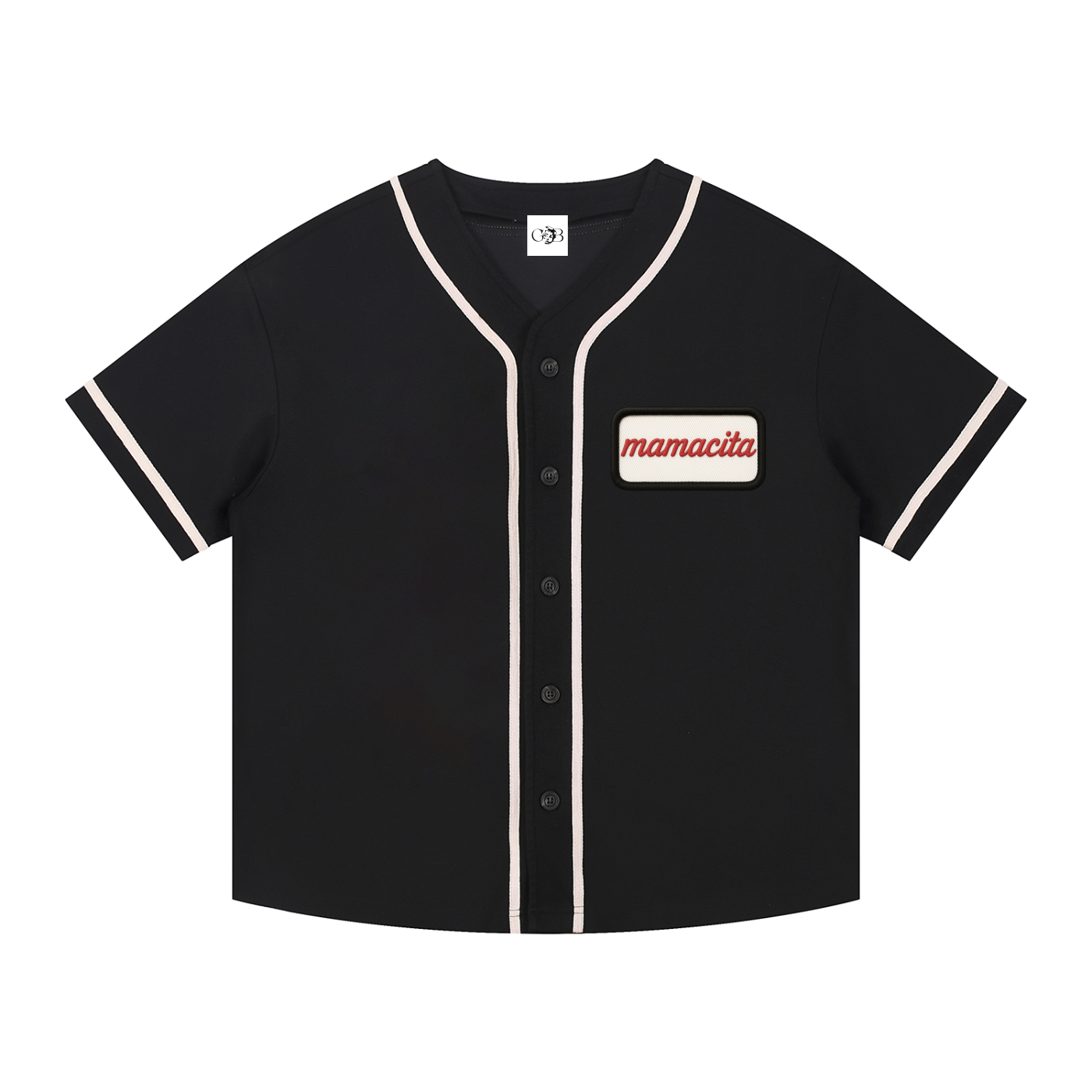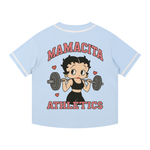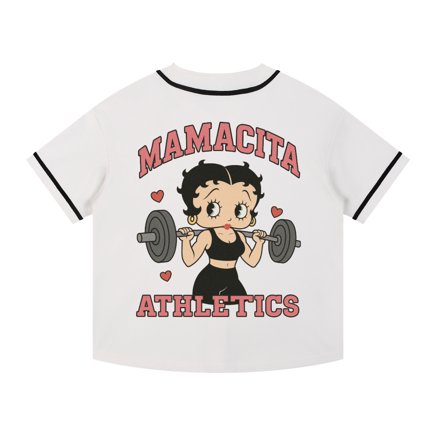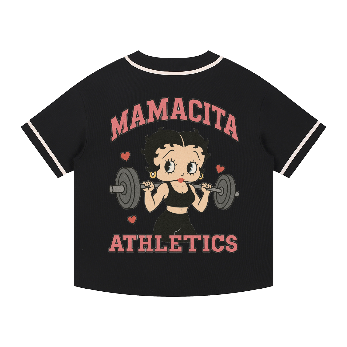 Featuring a flirty vintage-style print of a strong mamacita mid-rep, bold varsity lettering, and classic jersey piping, this top serves sporty and spicy. Perfect for running errands, chasing dreams, or just chasing your kids — either way, you’re putting in the reps. 🖤🔥