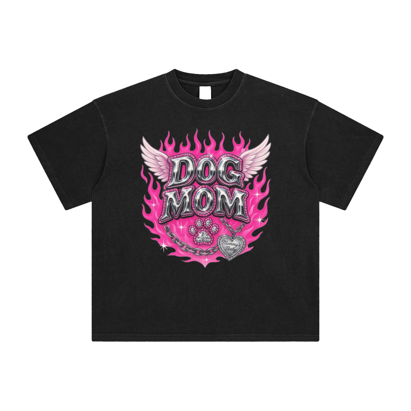 This isn’t your average dog mom shirt — it’s a ride-or-die statement piece. Dripping in Y2K attitude, this tee features bold chrome “DOG MOM” lettering surrounded by hot pink flames, angel wings, and rhinestone bling that hits like street couture. The chain and heart tag etched with “Mommy’s Baby” add that bad-girl energy your closet’s been begging for.