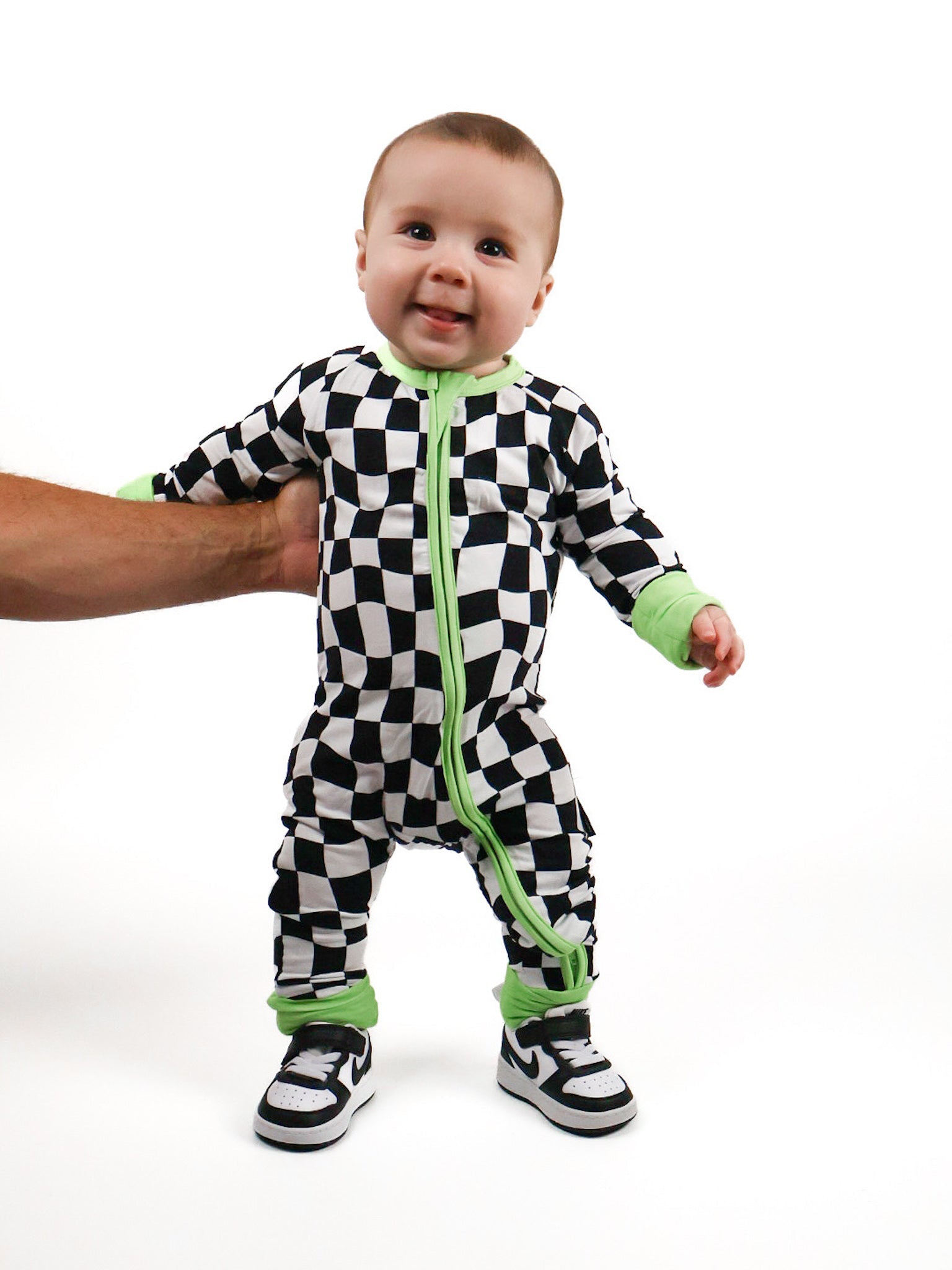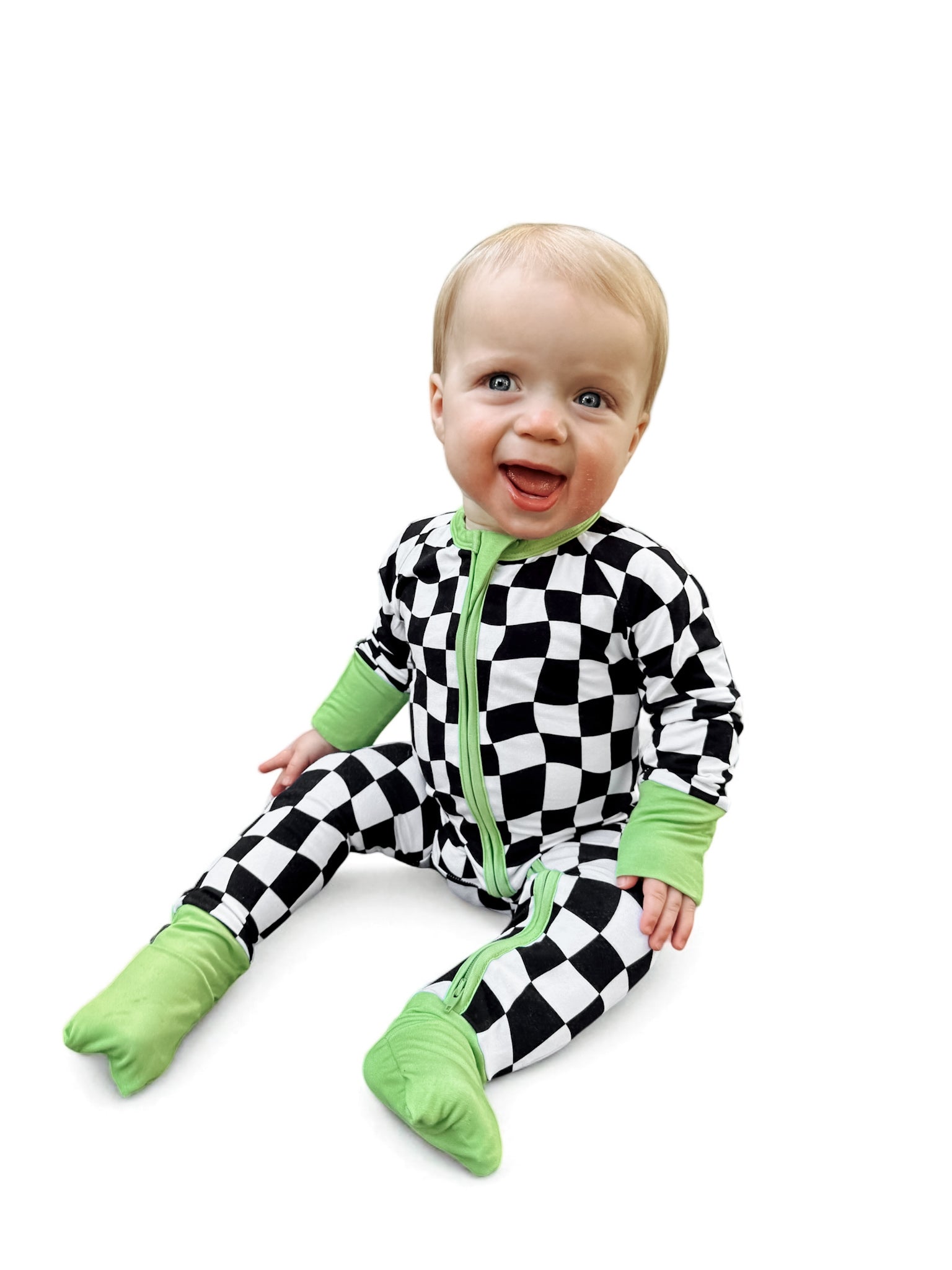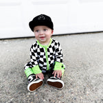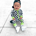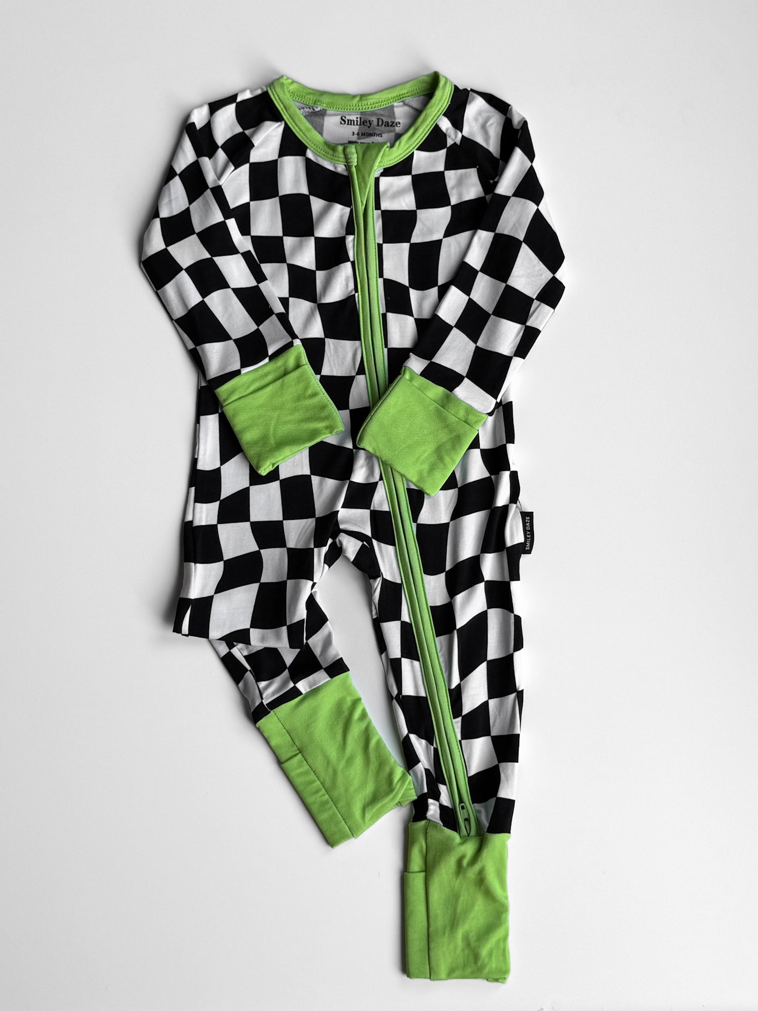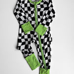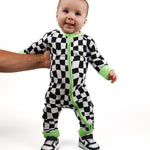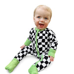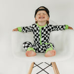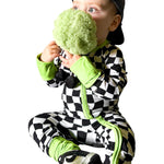 Say hello to bedtime with a twist. The Twilight Zone Zippies are made from buttery-soft, breathable bamboo — perfect for daydreams, playtime, or lights-out snuggles. Featuring a bold warped checkered print with electric green trim, this sleeper brings a little chaos (the cute kind) to your baby’s nighttime wardrobe.