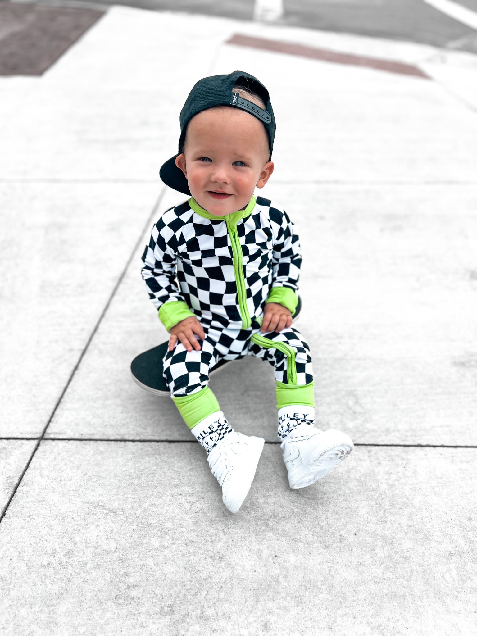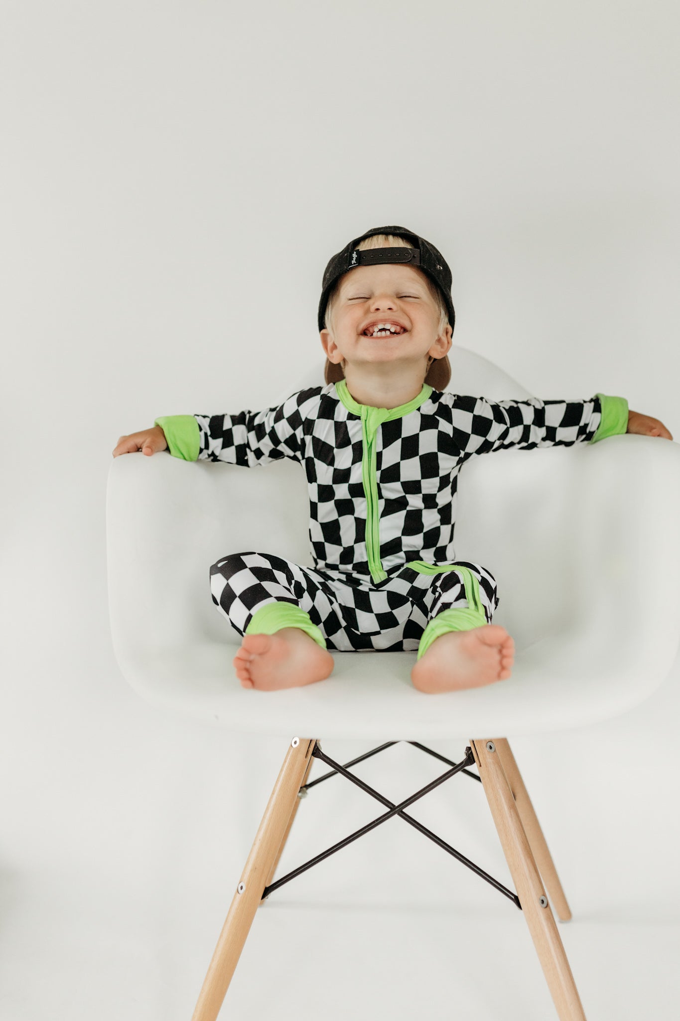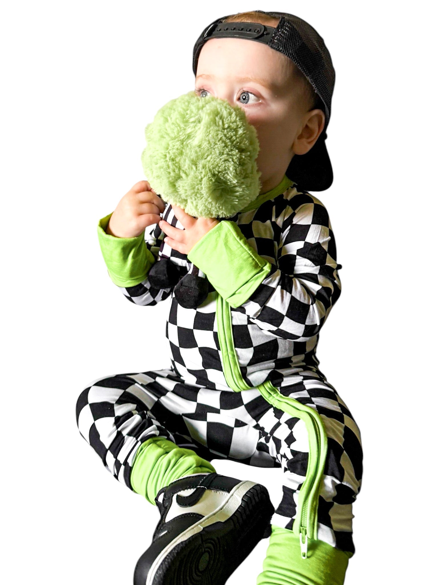 Say hello to bedtime with a twist. The Twilight Zone Zippies are made from buttery-soft, breathable bamboo — perfect for daydreams, playtime, or lights-out snuggles. Featuring a bold warped checkered print with electric green trim, this sleeper brings a little chaos (the cute kind) to your baby’s nighttime wardrobe.