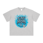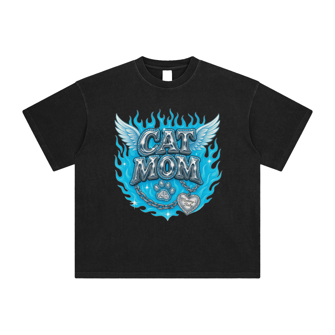 This isn’t your basic cat mom tee — it’s a bold love letter to every glam girl who treats her feline like royalty. Drenched in Y2K attitude, this tee features bold chrome “CAT MOM” lettering surrounded by electric blue flames, angel wings, and rhinestone bling that hits like street couture. The chain and heart tag etched with “Mommy’s Baby” add that bad-girl energy your closet’s been begging for.